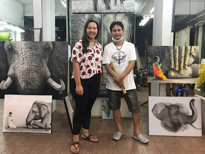 At one point, we found a little alleyway that led down to a basement of a building, so we decided to check it out. Turns out, it is a bus terminal that was transformed into an art gallery when the market is open. Oil paintings and canvas drawings were everywhere, and artists could be found hard at work, painting right there on the spot. I wasn't planning on buying any art, until I saw a man who was working on the most beautiful elephant piece. I couldn't believe my eyes that it was done by hand and not a print of a photo. I immediately walked to him and watched him work. We chatted for a bit, and he started telling me about his technique of using charcoal and a Chinese brush, as well as the different elephants that he's painting. At this point there was no way that I was walking away without a piece of his work, so I ended up buying a small canvas with a baby elephant on it, which ended up being my favorite purchase of the night (which is saying a lot, because I bought quite a bit of things).