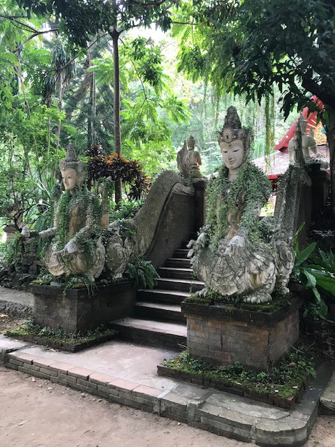Sunday was also day full of activities. Annika and I slept in late again, and then couldn't figure out what to do in the afternoon. I have a really detailed map that's got a lot of different highlights of Chiang Mai on it, so we spent some time looking at that to determine what to do. We landed on going to visit Wat Chedi Luang, so we put on our wat-appropriate clothing (long skirt and shoulders covered) and took a Grab there. The wat was bustling, full of tourists and locals alike. The temples we saw were so ornate with their gold detailing and colored glass decorations, and lots of Buddas were involved.